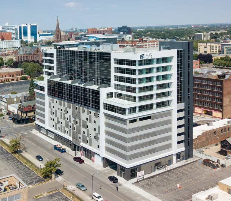 Perched up above a seemly 6-story precast podium parking garage stands a hotel and apartments that rely on the durability of precast to provide key functionality to the structure. While the garage is an open design for natural ventilation, the designers observe a balance using large wall panels with a square reveal to create the visual of sectioned windows on a standard building. Being able to factor in the finished material by augmenting another material elevated off the precast panels was a benefit to using precast concrete on this project to create the feel of a cohesive building and not a parking garage.